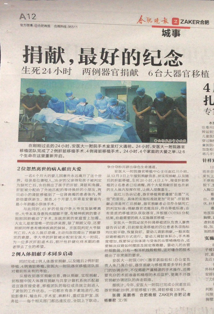 据安徽商报报道,从12月3日早晨起,安医大一附院手术室里连续24小时灯火通明。在此期间,安医大一附院器官移植团队完成了2例肝脏移植手术、4例肾脏移植手术。24小时,安徽、湖北的4个家庭的大爱之举,让6个生命在这里开始了他们新的人生。