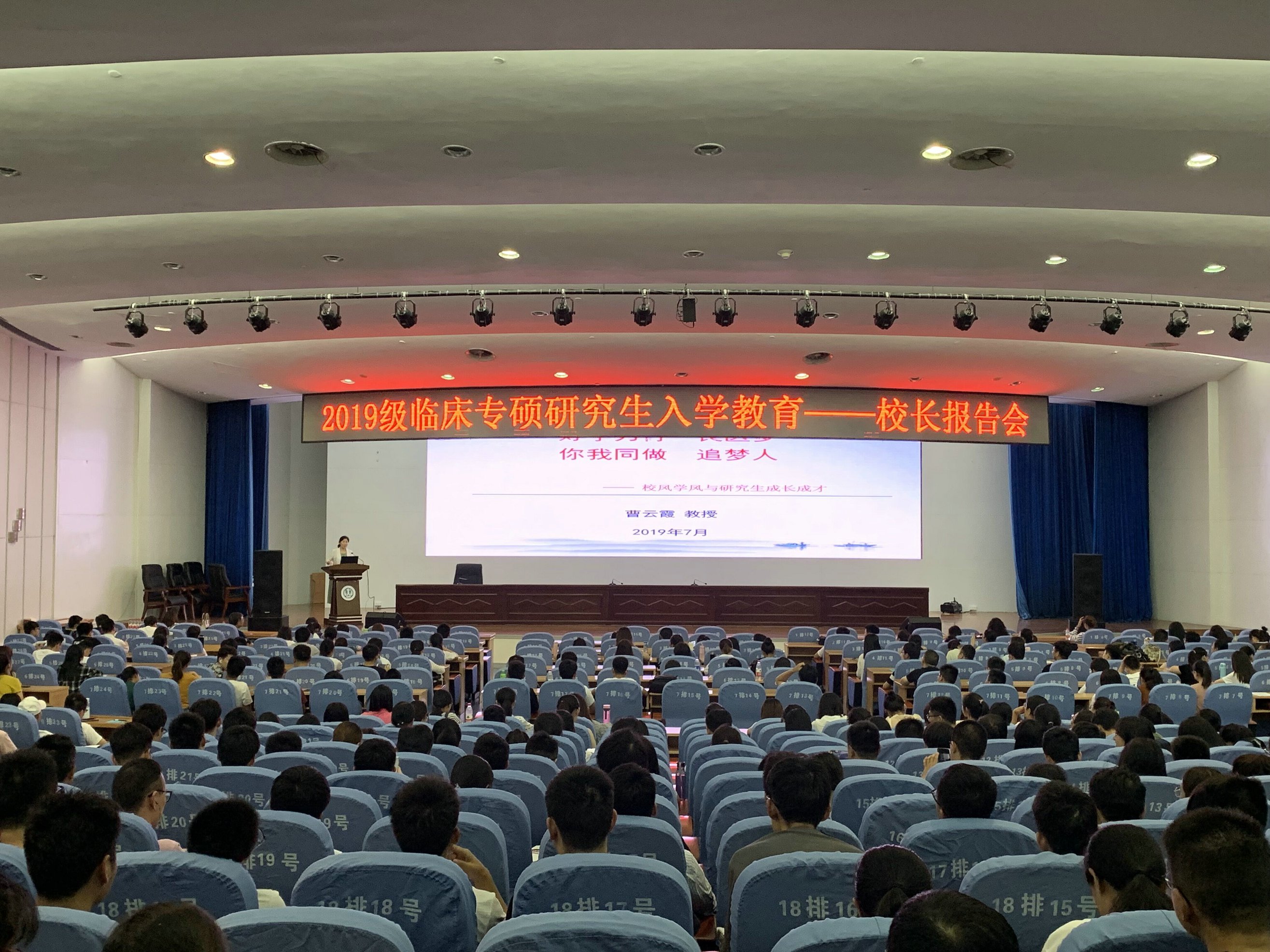 7月15日下午,学校举行2019级临床专硕研究生入学教育报告会,校长曹云霞作了题为“好学力行良医梦、你我同做追梦人”的专题报告。曹云霞以新时代青年大学生的责任和担当开篇,与在场研究生分享了自身成长的经历,她勉励研究生要抓住新时代的有利机遇,把人生理想融入到实现中华民族伟大复兴的中国梦的奋斗中,广大学子要坚信教育的力量、坚信自己的选择、坚信奋斗的回报、坚信未来的美好。