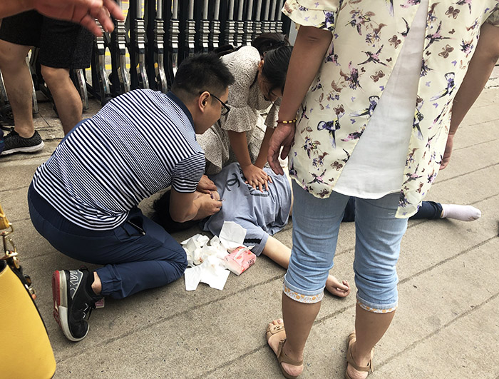“我摸了她的脉搏,发现她的手已经发凉。当时发现她的口腔里有食物残渣,应该是正在吃的肉包,怕肉馅堵塞气管,我和周老师用手从她的口腔里抠出食物残渣。”路过的我校17级博士生梁波说,“就在这时一位路过的女护士冲到病人身边”。
