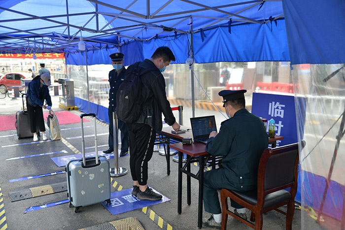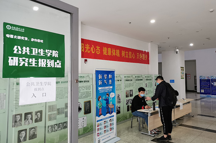 到达学院报到处,王聪按要求提交了申请返校申请书、健康信息登记表、健康码以及14天个人旅行轨迹信息,经学院工作人员核查无误后,拿到了住宿证明并领取了口罩、消毒洗手液以及体温计等防护物资。“作为一名医学生,学校为我们能够平安顺利返校做的一系列防护措施让我很感动,也充满了安全感,我也会配合学校和学院,按要求严格做好返校后的各项疫情防控工作。”在学生公寓楼下再次检查体温和登记个人信息后,王聪顺利到达所在宿舍,完成了入校手续。