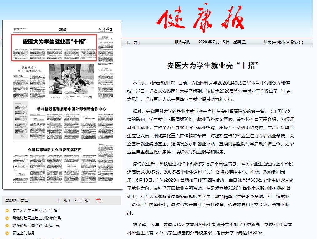 疫情发生后,学校通过网络平台收集2万多个岗位信息,本校毕业生通过线上平台投递简历3800多份,300多名毕业生通过“云”招聘被疾控中心、医院、政府部门录用。6月19日,举办2020年首场校园线下招聘活动,当日就有近300名毕业生初步达成了就业意向。该校还开展就业专题资助,在足额发放2020年毕业生求职创业补贴的基础上,对本人或家庭成员感染新冠肺炎学生、湖北籍毕业生等给予资助。对“慢就业”“缓就业”的毕业生,该校积极开展社会责任教育、心理辅导和人文关怀,帮扶不断线。