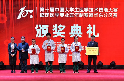 大赛中,来自46所高校的参赛队伍展开了激烈角逐,展示了深厚的理论功底和高超的实践技艺,显示了良好的应变能力和高度的团队精神,呈现了一场场精彩的医学盛宴。经过2天的高水平比拼,南昌大学、福建医科大学最终斩获本次华东分区赛特等奖,同济大学、蚌埠医学院、浙江中医药大学获一等奖,赣南医学院、温州医科大学、南京大学、南京医科大学、山东大学、山东第一医科大学获二等奖,上海健康医学院等34所高校代表队获三等奖。大赛还评选出单项奖20项。我校获最佳风尚奖,并与团体前11的参赛队一同晋级全国总决赛。
