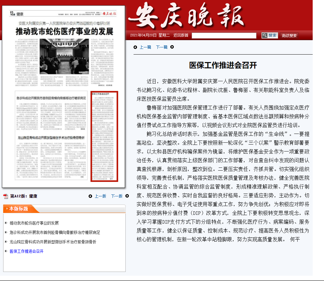 鲍习化总结讲话时表示,加强基金监管是医保工作的“生命线”。一要提高站位,坚决整改。全院上下要按照新一轮深化“三个以案”警示教育部署要求,以太和县医疗机构骗保案件为镜鉴,将维护医保基金安全作为一项重要政治任务,认真贯彻落实上级医保部门的工作部署,对自查自纠中发现的问题认真查找根源,剖析原因,整改到位。二要压实责任,齐抓共管。切实强化组织领导,完善责任机制,严格落实医院医保质量管理及考核办法,健全完善医院科室相互配合、协调监管的综合监管制度,形成精准理解政策、严格执行制度、规范医保收费、实时自我监督的良好格局。三要适应形势,主动作为。切实做好医保贯标、电子凭证使用等重点工作,努力争先创优;为积极应对即将到来的按病种分值付费(DIP)改革方式,全院上下要积极转变思想观念,深入学习掌握DIP支付方式下的分组特点,不断强化医疗行为、病案编码、服务质量等工作,健全以保证质量、控制成本、规范诊疗、提高医务人员积极性为核心的管理机制,在新一轮改革中站稳脚跟,努力实现高质量发展。 何平