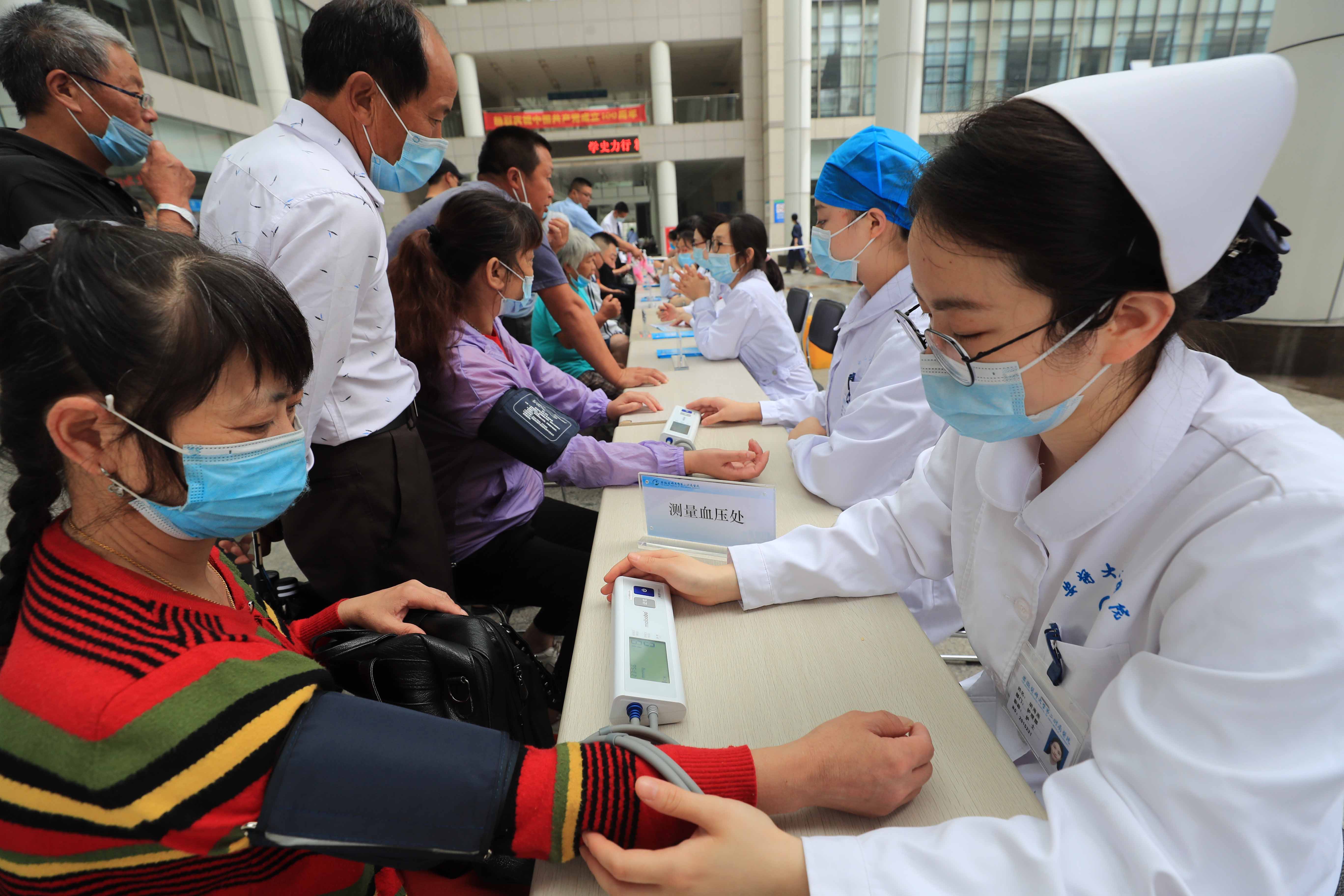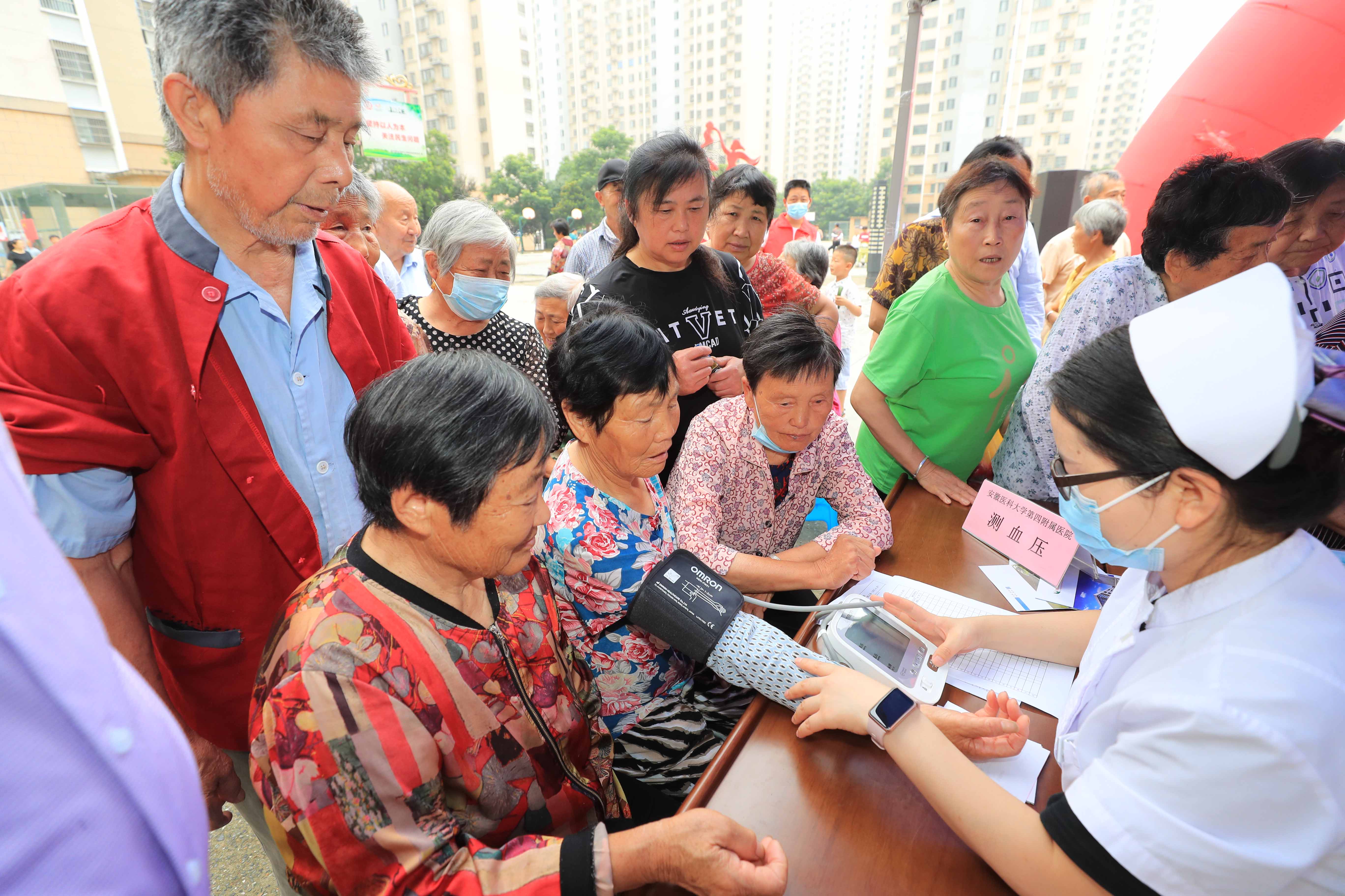在合肥市新站区,医务工作者在为社区群众量血压。