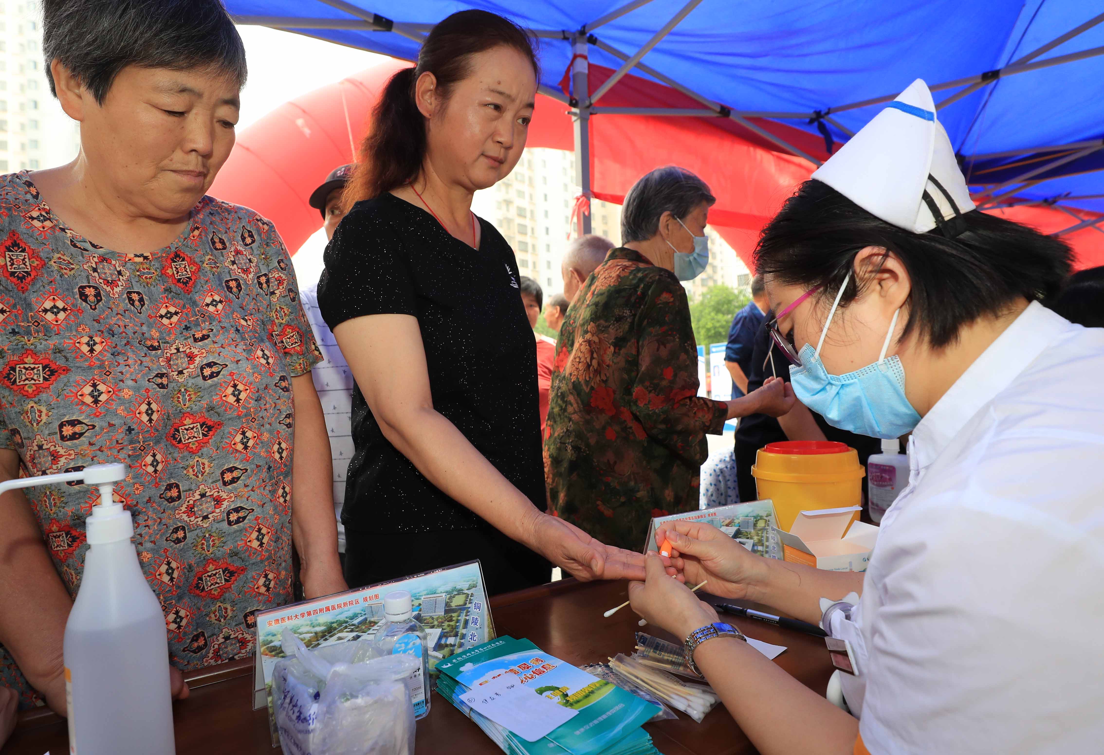 在合肥市新站区,医务工作者在为社区群众测血糖。