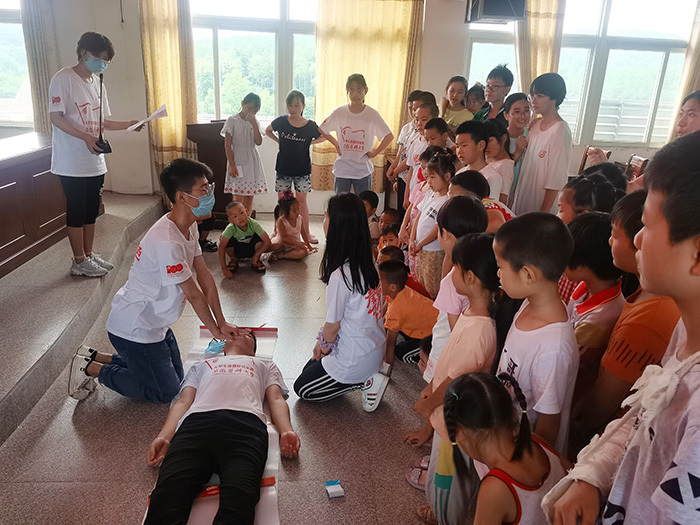 实践队员向龙山村学生演示心肺复苏术