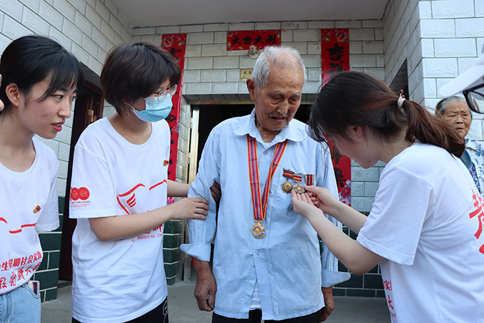 实践团队来到太湖县刘畈乡,瞻仰刘邓大军高干会议旧址,参观旧址展陈,学习革命历史,学生党员重温入党誓词,坚定理想信念。队员们走进刘畈乡九田村、江塘乡龙山村,关爱慰问两位92岁高龄的抗美援朝老兵詹绪凤、王文端,为老兵量血压、送上慰问品,与老兵一起合唱《中国人民志愿军战歌》,聆听老兵讲述抗战故事,接受革命传统教育。
