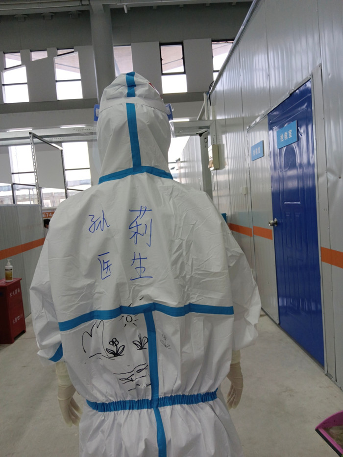 孙主任欣然答应了小姑娘的要求,5分钟后,她的防护服背后就增添了一幅素描山水画:画面的左边是一座山,小朋友说那是合肥的大蜀山,山下有盛开的鲜花和清澈的湖水,鱼儿在清澈的湖水中自由自在地游弋。小姑娘说,由于疫情,她已经好久没有出去旅游了,这么好的春色实在太诱人,于是画出了自己心目中春天该有的样子。