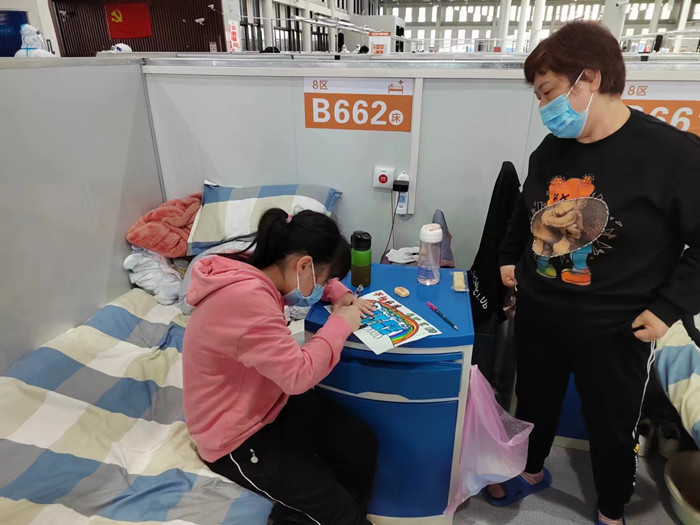 4月10日中午时分,我和同事孙莉医生在舱内巡查时,509床的一位小姑娘正伏在空气净化器上练习硬笔书法。作为一位五年级孩子的母亲,孙主任在方舱内看到孩子都会特别的关注,于是下意识地驻足,饶有兴致地观看并点赞。