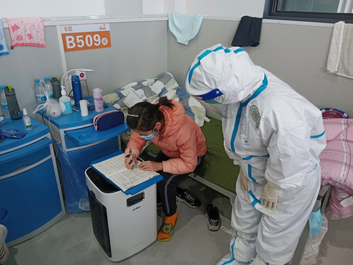 小姑娘落落大方,放下笔主动和孙主任聊起来。真是无巧不成书,小姑娘老家就是我们合肥郊区,目前跟随父母在上海生活,也刚好是五年级,平时学习成绩很不错。方舱遇老乡,孙主任自然也是倍感亲切,给小姑娘说起了自己的孩子,并分享了一些自己平时教育孩子的学习方法和经验,表扬小姑娘在方舱内仍然坚持学习,鼓励她克服暂时的困难,积极适应环境配合治疗,争取早日康复出舱。