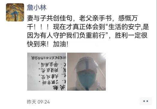 “家人的守护与理解,是我们勇往直前的坚强后盾。”詹小林说,“妻子和儿子共同创作了一首诗,支持我们工作。在工作中,我看到了大家团结一心、共同抗疫的感人场面。我坚信,只要我们同舟共济,万众一心,最后的胜利一定属于我们。”(完)