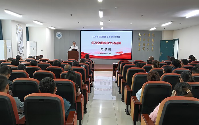 骆广东表示,学院全体同志要全面深刻领会全国教育大会精神,深刻认识加快建设教育强国的重大任务,大力弘扬教育家精神,积极践行学校“一训三风”,努力传承药学院院训,接过手中接力棒,跑好新时代新征程新领域新赛道。要把落实大会精神融入学院党建大格局,切实把坚持党对教育事业的全面领导落实到位;融入学院人才培养,坚持把立德树人根本任务落实到位;融入师资队伍建设,坚持把教师队伍建设作为基础性工作落实到位;要融入学科建设和教育教学,切实把坚持服务中华民族伟大复兴事业的教育使命落实到位。