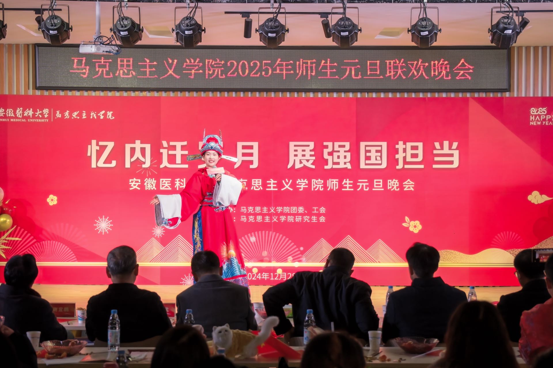 悠扬婉转歌曲《上春山》,仿佛带着现场师生一同进入了绿水青山的世外桃源;舞蹈《红马映江南》中,舞者用肢体勾勒出江南水乡的温婉与灵动;歌曲《如愿》唱尽家国情怀与岁月温柔,现代舞蹈《舞动青春动扬》则俏皮活泼,洋溢青春活力。歌曲《黄梅戏》将流行与戏曲元素相交织,展示了黄梅戏的独特韵味;小品《礼让六尺巷》,让观众在欢笑中感悟中华优秀传统文化和谐之道;经典爱国赞歌《共和国之恋》,以激昂旋律诉说科研人员对祖国的赤诚之心;《相亲相爱》唱出了全院师生“天下一家、团结和睦的美好愿景。整场晚会在师生共同合唱的《歌唱祖国》中落下帷幕。