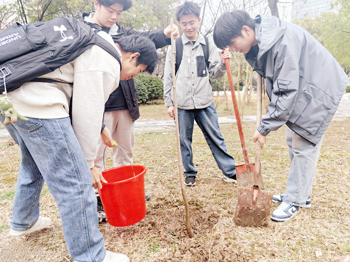 活动现场,同学们热情高涨,有序领取工具并迅速投入到植树行动当中。在老师的指导下,大家以小组的形式分工合作,配合默契。有的挥锹铲土,有的扶苗填坑,有的浇水灌溉,每一个步骤都认真细致,有条不紊。经过大家的共同努力,一株株树苗在翡翠路校区“安家落户”。看着亲手种下的树苗整齐排列,为校园增添了一片生机勃勃的绿意,同学们的脸上都绽放出了自豪的笑容。