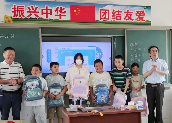 在黄泊渡小学教室里,一场别开生面的“急救训练营”小课堂正在进行。吕雄文走进教室,认真观摩实践团成员为孩子们带来的CPR(心肺复苏术)急救知识培训。实践团成员通过情景模拟,生动讲解CPR环境评估和意识判断要领,并演示胸外按压和人工呼吸动作规范,吕雄文不时点头肯定。课程结束后,吕雄文一行将提前准备的书包、文具和消暑营养品赠送给小学生,孩子们收到礼物后,脸上洋溢着灿烂的笑容。